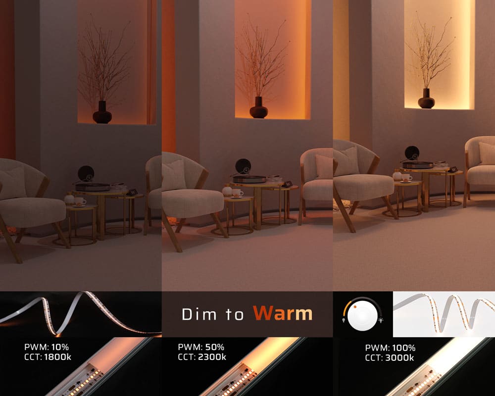 The Dim to Warm LED flexible strip light utilizes the principle of PWM dimming, incorporating a unique dual-color temperature LED circuit design. During the PWM dimming process, it automatically transitions from cool white to warm white, creating a soft and comfortable lighting ambiance. This “dim to warm” characteristic is the core highlight of the Dim to Warm LED strip light.