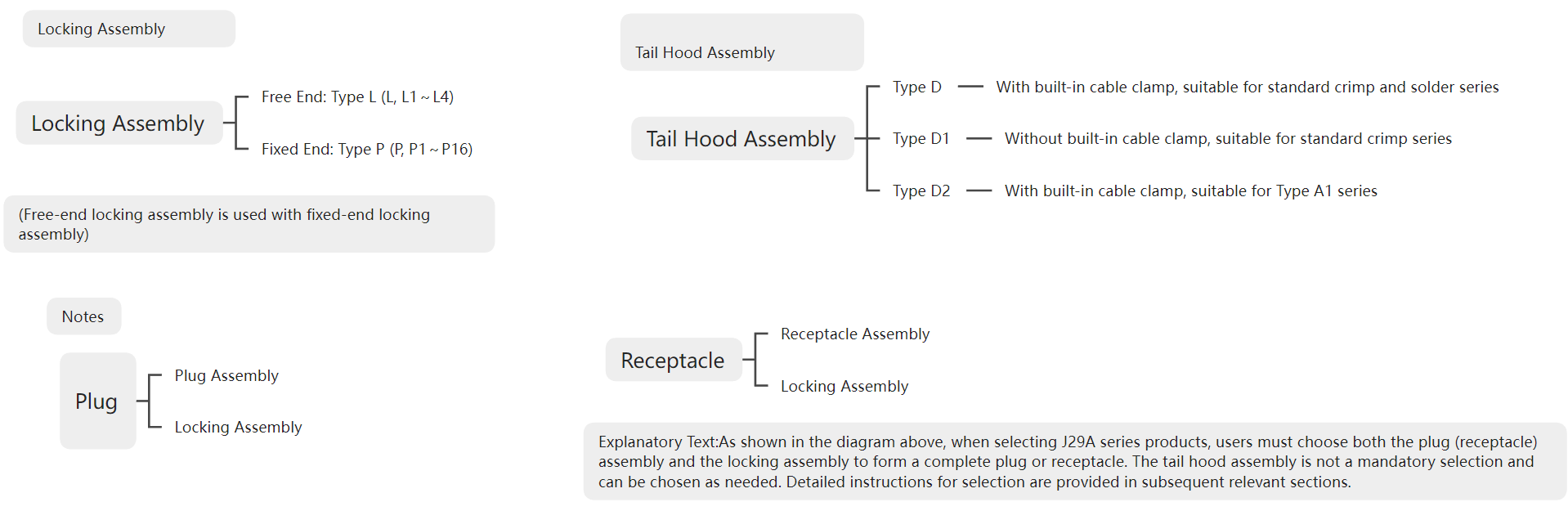 ⑥ Locking Component Category: See "J29A Locking Components" for details; Note: P3, P4, P6, P13, P15 type locking components are exclusively for J29A-□TJW/ZKW/TJWI/ZKWI products