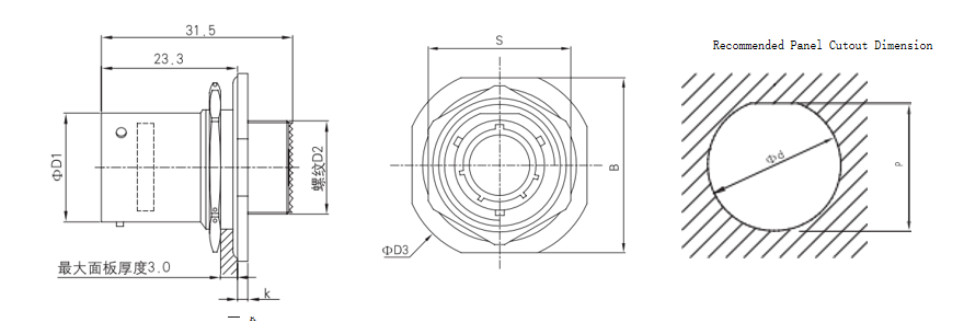 | Shell Size | D1 | Thread D2UNEF-2A | D3 | K | B | S | d | P |
