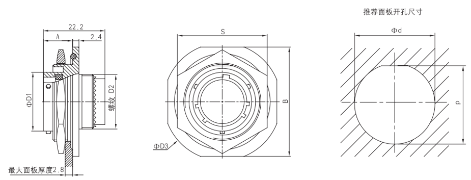 | Shell Size | D1 | Thread D2 UNE F-2A | D3 | A | B | S | d | P |