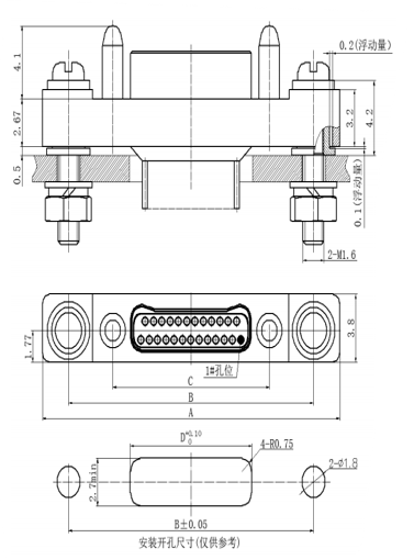 This connector is equipped with a guide column and a floating rivet tube, and is used when blind fitting is required. It is generally connected to a socket with a guide hole。